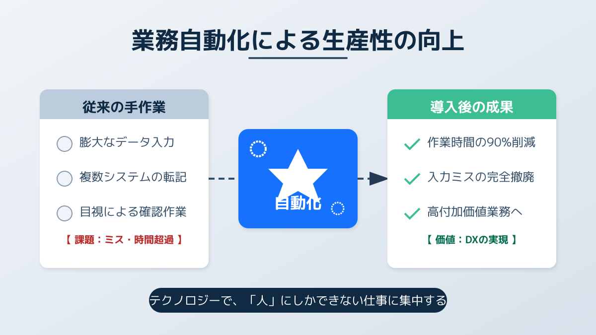 実際の現場でどのように業務が変化するのか、より具体的な実践例を知りたい方は、【週5時間の工数削減】ビジネスを自動化する身近なAI活用事例|AIエージェント導入ガイドや、教員の働き方が面白いほど変わる!教育現場の生成AI活用事例と導入ガイドも併せてご参照ください。