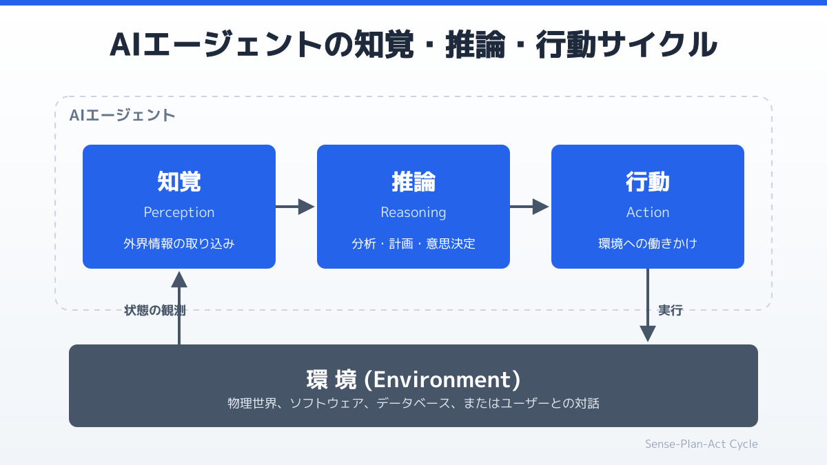 ビジネス現場において、従来の対話型AIから一歩進んだ自律的な業務遂行が求められています。そもそもエージェントとは、ユーザーの指示を毎回待つのではなく、与えられた最終目標に向けて自ら状況を知覚し、最適な手順を推論して行動を起こすソフトウェアを指します。単なるテキスト生成にとどまらず、外部のデータベースやAPIと連携し、一連のタスクを自動で完結させる点が、AIエージェントの最大の特徴です。