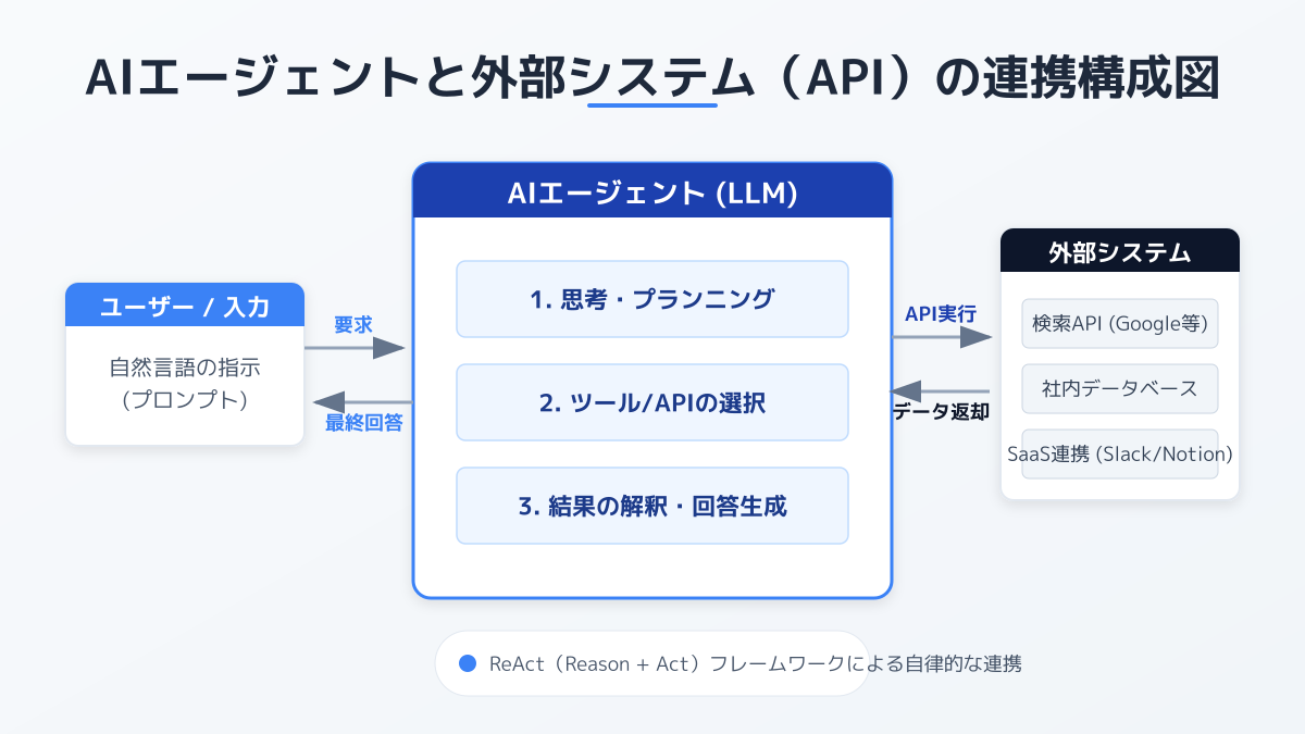 AIエージェントをビジネスに導入する上で、3つ目の重要なポイントは「外部システムとの連携による自律的なタスク実行」です。単なる対話型の生成AIとは異なり、AIエージェントは与えられた目標に対して自ら計画を立て、必要なツールを呼び出して業務を完結させる能力を持っています。自社の業務フローにどう組み込むかを検討することが、高度な業務自動化への第一歩となります。