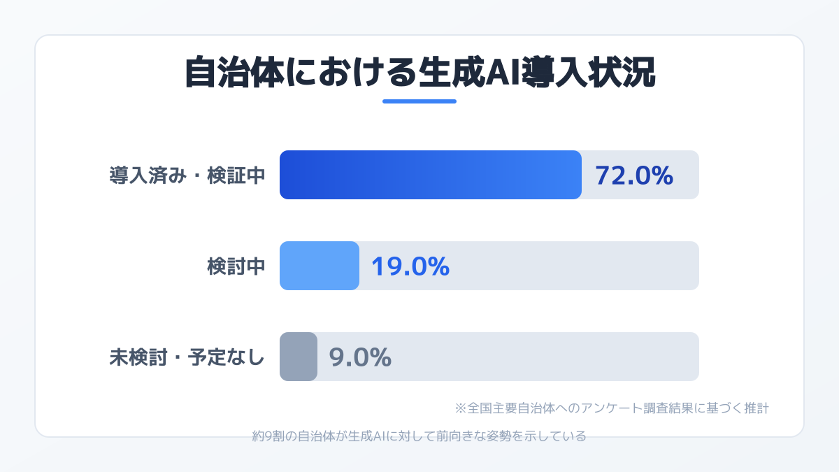 自治体における生成AIの活用は、一部の先進的な取り組みから、全庁的な業務改革のインフラへとフェーズを移行しています。ここでは、全国の自治体における導入の現在地を把握します。