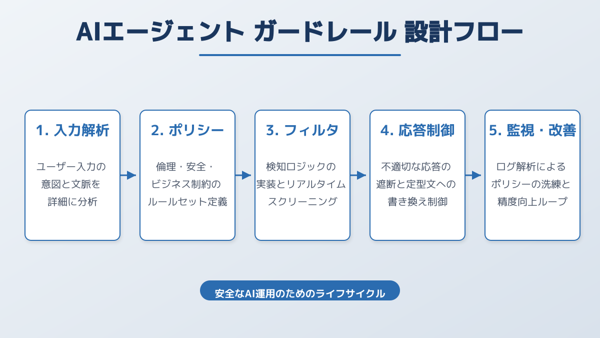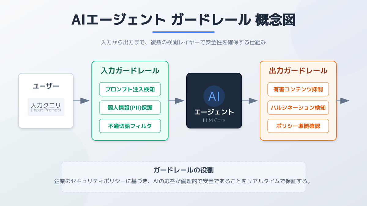 セキュリティやハルシネーションのリスクを軽減するために不可欠なのが、AIエージェントに対するガードレール設計です。ガードレールとは、AIが不適切な出力を生成したり、許可されていないシステム領域にアクセスしたりするのを防ぐための「安全枠」を指します。