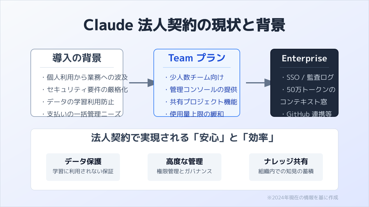 企業がClaudeを導入する際、個人向けのProプランではなく、組織向けのClaude 法人プラン(TeamプランやEnterpriseプラン)を選択すべき明確な理由があります。ここでは、各プランの違いを比較し、自社に最適なプランを選ぶための選定基準を解説します。