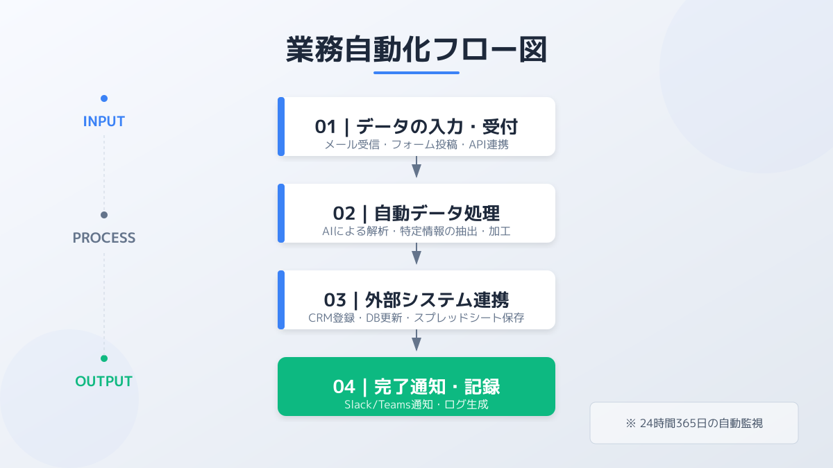 手順が明確でありながら、自然言語での判断が介在する業務が向いています。例えば「過去の類似案件のドキュメントを探して要約し、顧客向けの一次回答案を作成する」といった、リサーチと文書作成が複合したタスクで最も高い効果を発揮します。
