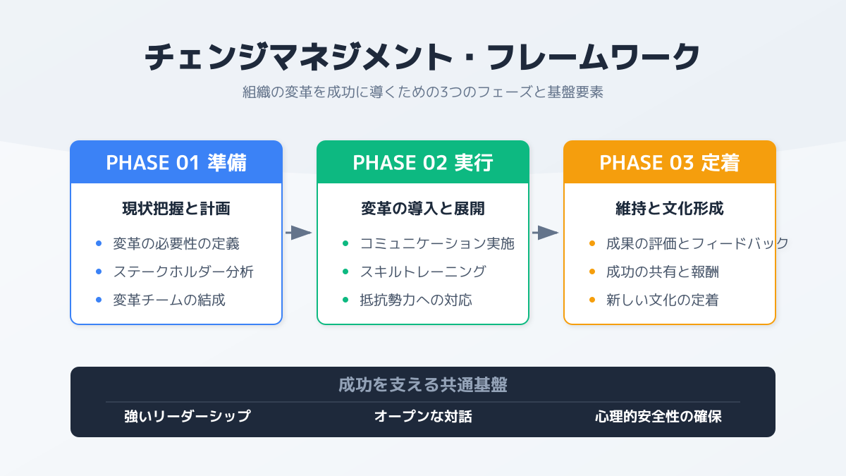 DXやAI導入を成功に導くためには、技術的な側面だけでなく、プロセスや文化を見直す組織変革が不可欠です。本記事で解説した3つの実践ステップとフレームワークを活用し、現場への定着を進めてください。
