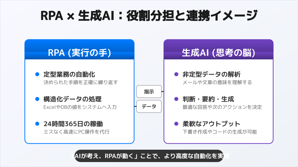 業務効率化においてRPA(Robotic Process Automation)は、ルールが明確なデータ入力やシステム間の転記など「決まった手順の反復」に圧倒的な強みを持ちます。一方で生成AIは、メールの要約、議事録の作成、顧客対応のドラフト作成など「文脈の理解や文章生成」を伴う非定型業務を得意としています。
