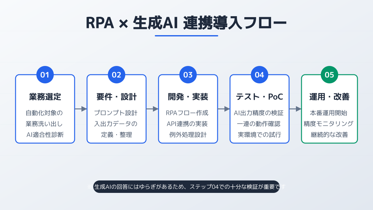 生成AIとRPAを組み合わせたシステムを構築する際、導入プロセスと運用体制の設計が成功の鍵を握ります。