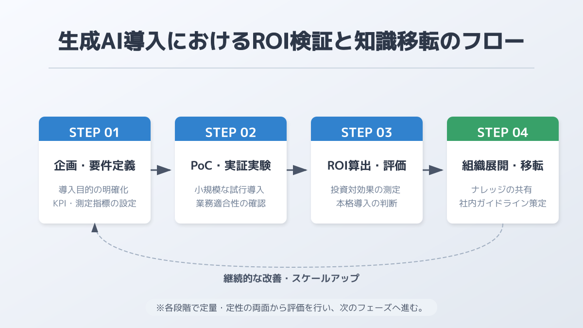 - ROIの明確化: 導入前に具体的なKPIを設定し、効果を定量的に測定する仕組みを構築する。