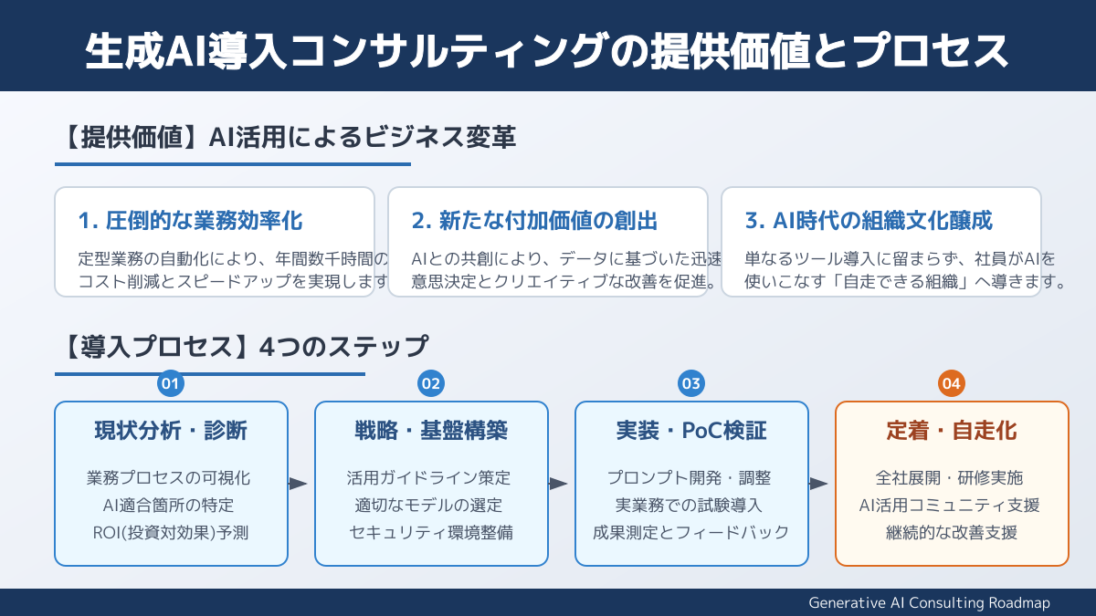 一方、外部の生成AI導入コンサルを活用した場合、導入後6ヶ月以内に業務効率が平均25%向上したというデータがあります。専門家の知見を借りることで、初期の立ち上げスピードを劇的に早めることが可能です。
