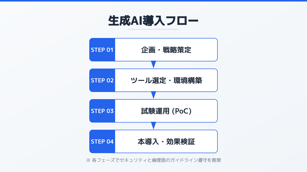 本格的な生成AI導入を単なるコスト削減ではなく、組織全体の生産性を引き上げる投資とするためには、現場での安全な運用までしっかりと押さえてプロジェクトを進めることが重要です。