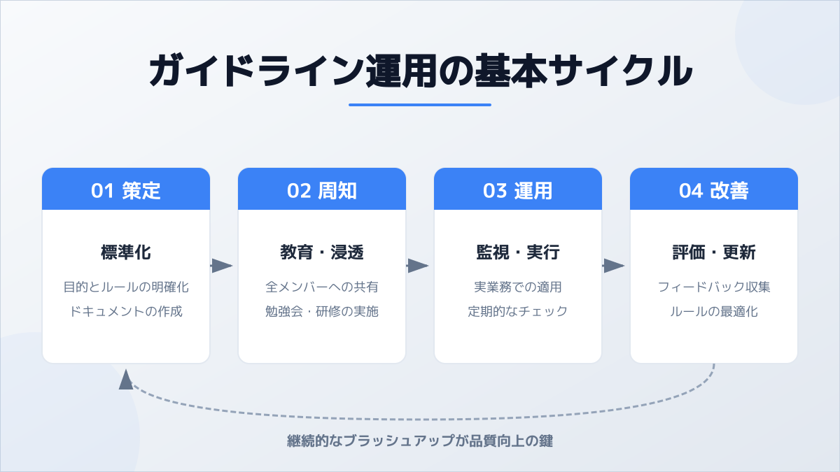 - 従業員への定期的な教育・研修を実施し、ガイドラインを柔軟に更新する運用体制を整えること。