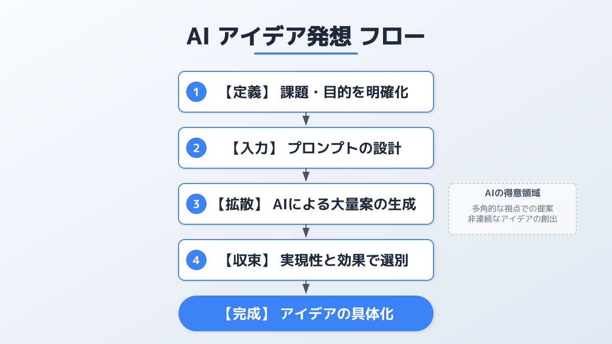 ここでの判断ポイントは、AIをゼロイチの創造ではなく、「壁打ちや情報構造化のツール」として位置づけることです。人間が用意した乱雑なメモを構造化したり、ブレインストーミングの相手として複数の切り口を提示させたりする使い方が効果的です。