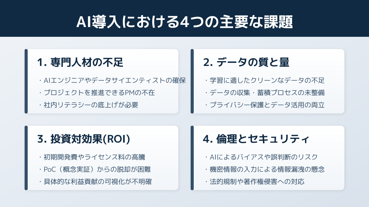 現場で運用する際は、悪意のある入力によってAIを誤作動させるプロンプトインジェクションへの対策や、社内向けガイドラインの策定を行い、安全なワークフローを構築してください。【2026年版】AI導入失敗の7大原因とは?コンサル不要で確実な導入効果を出す手順 で導入の失敗を防ぐポイントも確認しておきましょう。